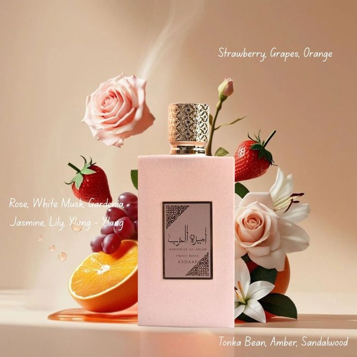 Ameerat Al Arab Prive Rose by Asdaaf is a floral-oriental fragrance with fruity, rose, and amber accords. It opens with fresh fruity notes, followed by a floral heart dominated by rose. The base blends musk, amber, and vanilla, creating a warm finish with good longevity.